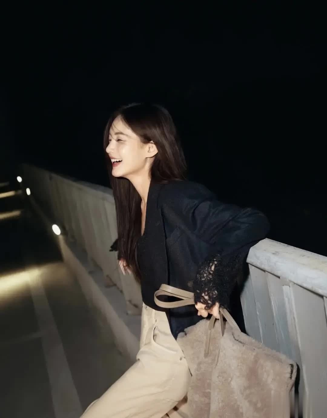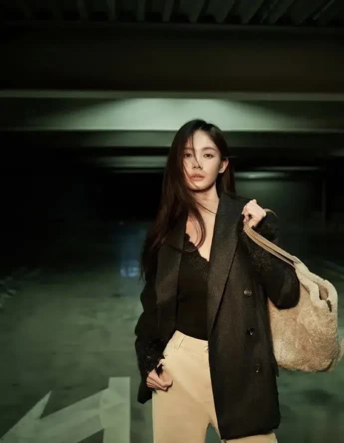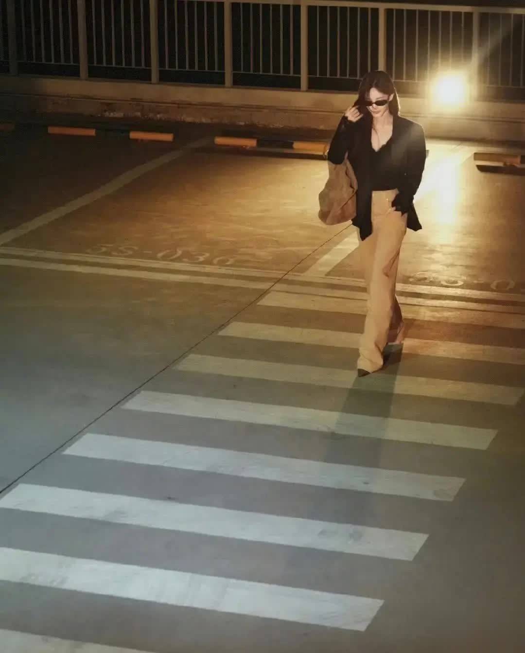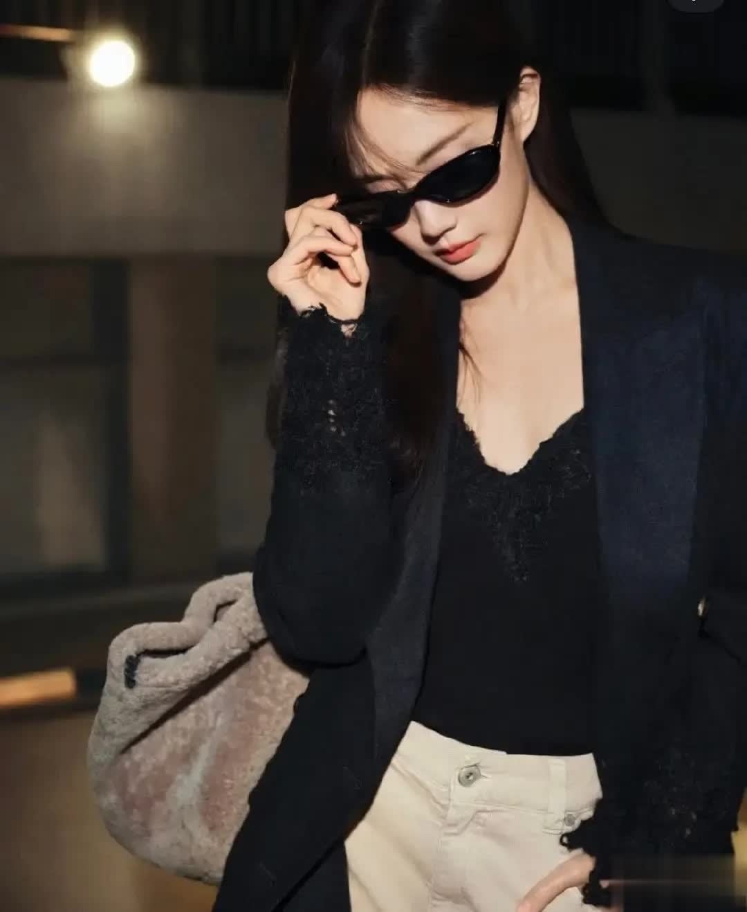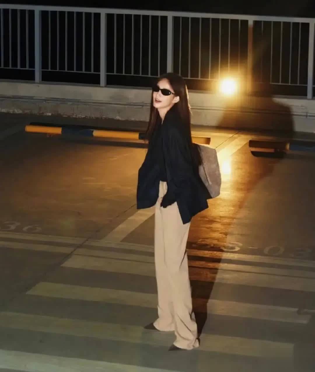 她身着黑色西装搭配米色阔腿长裤,利落剪裁勾勒出纤薄却极具支撑力的廓形,脚踩平底乐福鞋,手拎毛绒包袋,一副墨镜轻轻架在鼻梁,冷感与慵懒并存。不笑时眼神凌厉,眉眼间透出清冷疏离,而肢体却呈现出松弛自然的状态,被网友形容为“毫不费力的权威感”。这一身看似随意的搭配,却每一步都踩在“把妹BGM”的节奏上,迅速登上热搜榜首。
