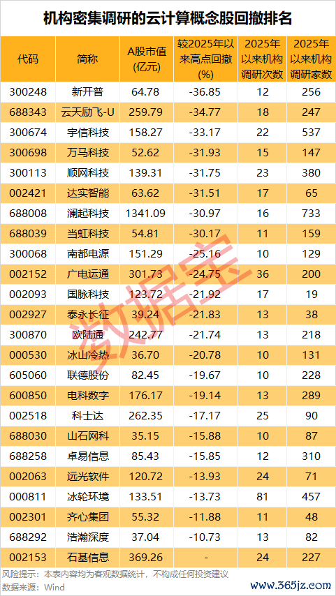 机构密集调研的云计算概念股回撤排名出炉机构密集调研的云计算概念股回撤排名出炉
