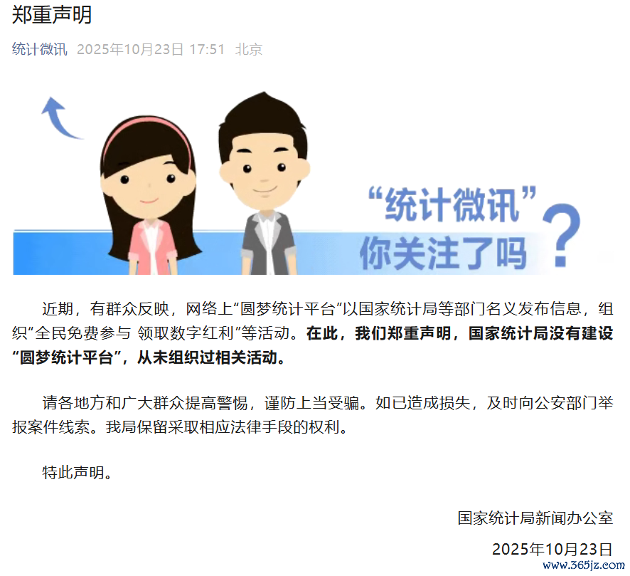 国家统计局郑重声明:从未组织过“圆梦统计平台”相关活动国家统计局郑重声明:从未组织过“圆梦统计平台”相关活动