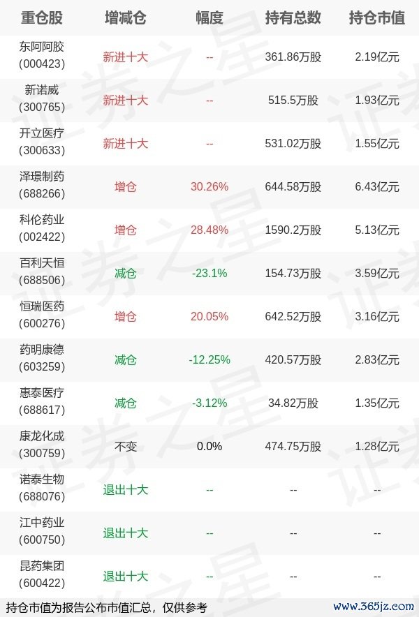 本站消息MOM操盘网,4月21日广发基金旗下吴兴武管理的广发医疗保健股票型基金公布一季报,近1年净值增长率10.81%。与上一季度相比,该基金前十大重仓股新增东阿阿胶,新诺威,开立医疗;并对泽璟制药增仓149.74万股,为该基金第一大重仓股;诺泰生物,江中药业,昆药集团等退出前十大重仓股;详细数据如下:
